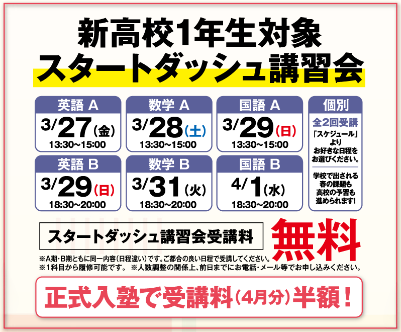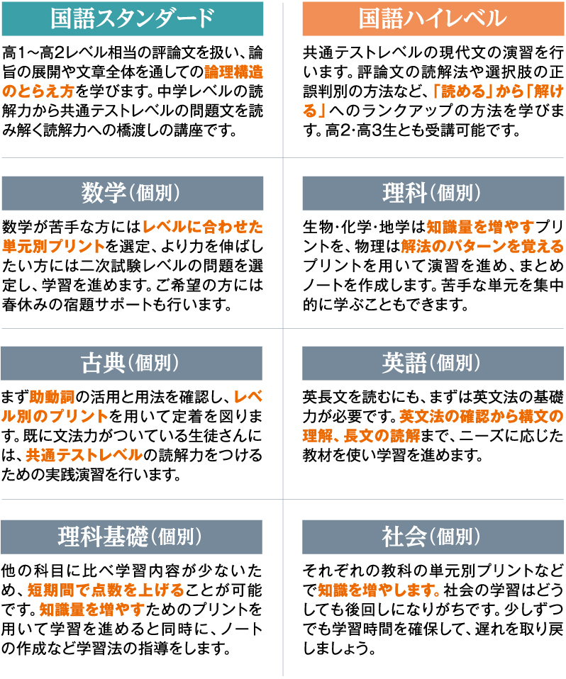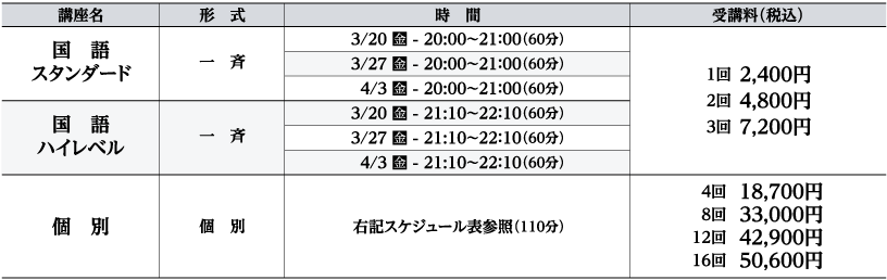 ※個別講座は、1回から受講できます。国語(スタンダード・ハイレベル)も各回独立した講座ですので、1回から受講できます。