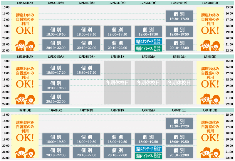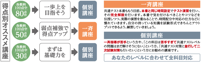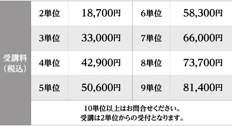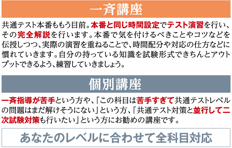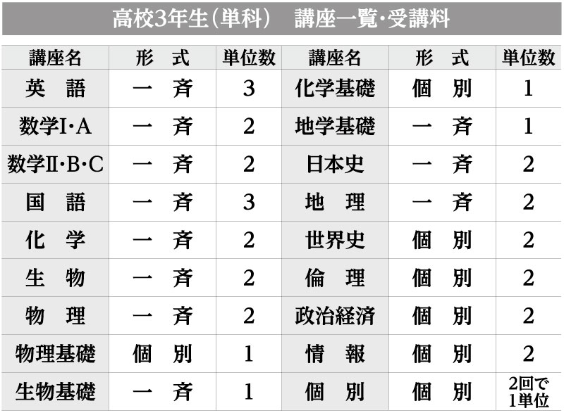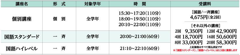 ※講座名「個別」は、2回で1単位となります。指導内容については上記の「個別講座」をご覧ください。