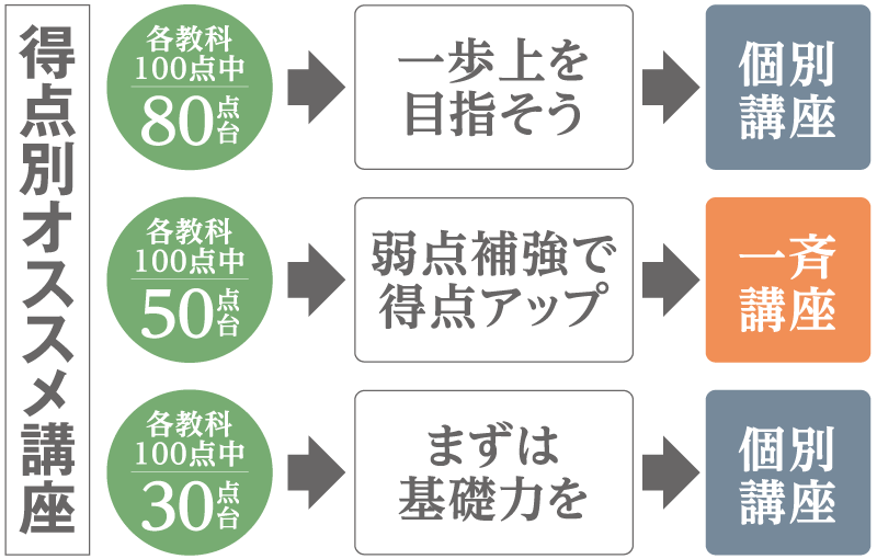 個人別に全科目対応いたします。理科・社会・国語(古典)をご希望の場合などは「個別講座」をご選択ください。科目・内容につきましては、事前にご希望をお伝えください。生徒さんと相談しながらレベルに合った問題をお渡しし、指導していきます。